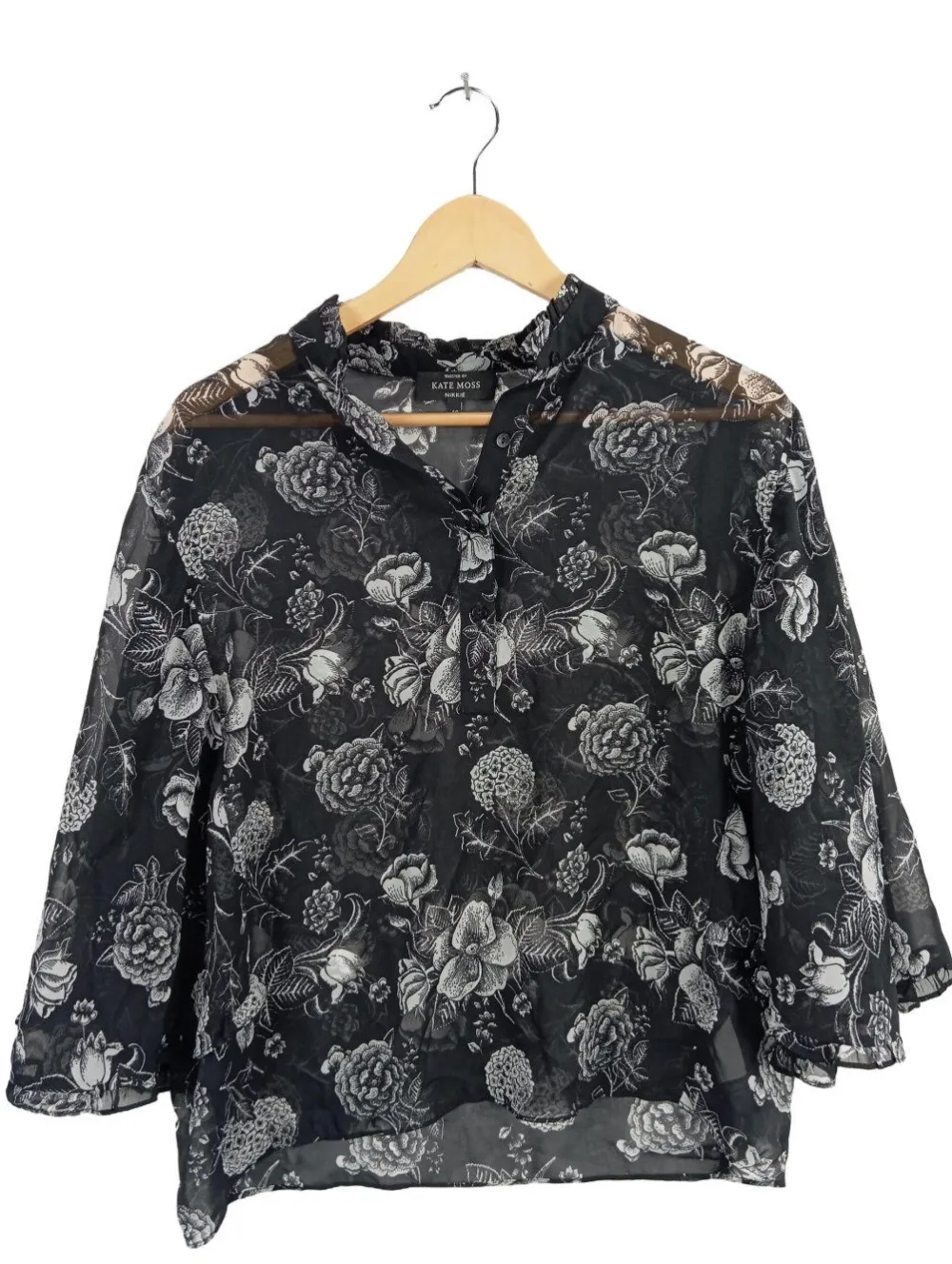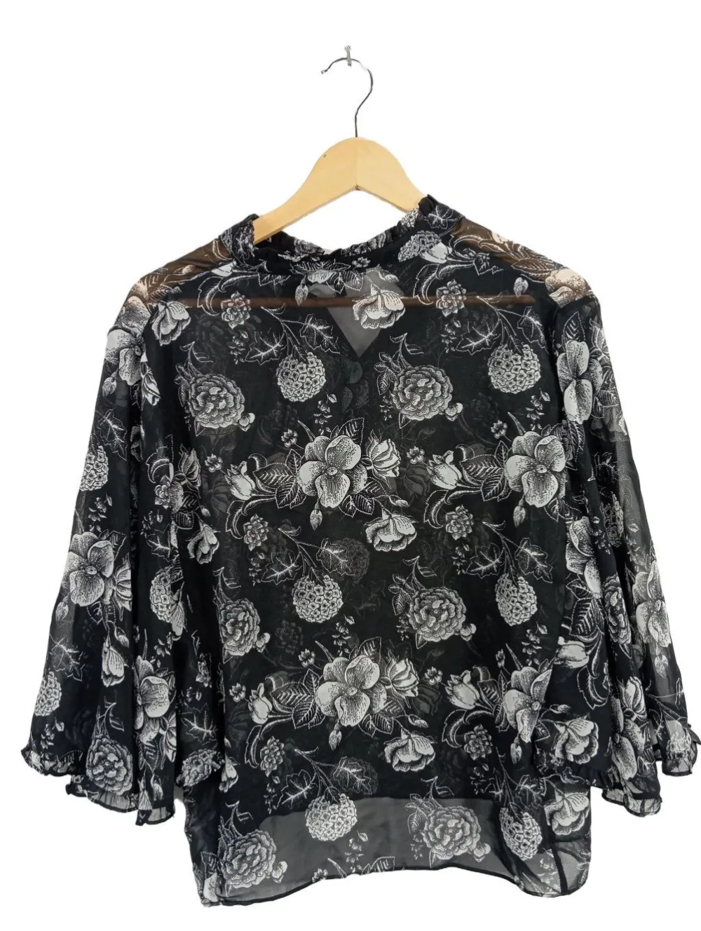 - Knopfleisten-Ausschnitt, Stehkragen, Wellkanten am Ärmelsaum, Knopfverschluss, Allover-Druck, Blumenmuster, Casual-Look, schlichter Stil, Transparenz-Optik