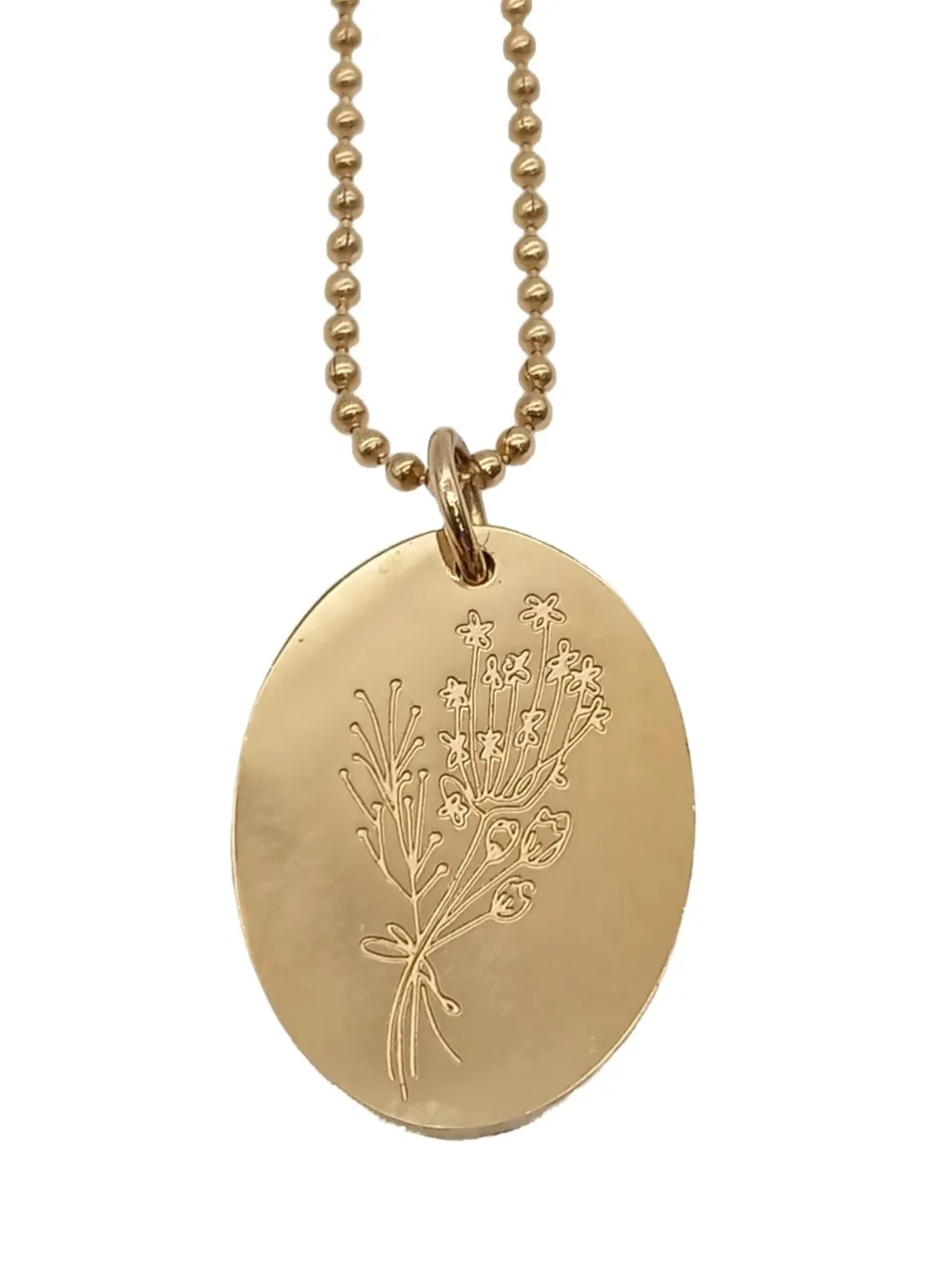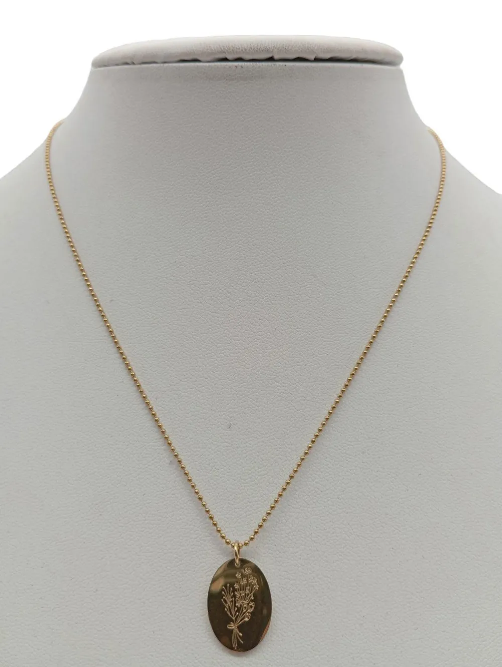 - Details: goldfarbiges Material, feingliedrige Kette, kleine Anhänger, längenverstellbare Kette, runder Anhänger, Labelgravur, Metallelemente