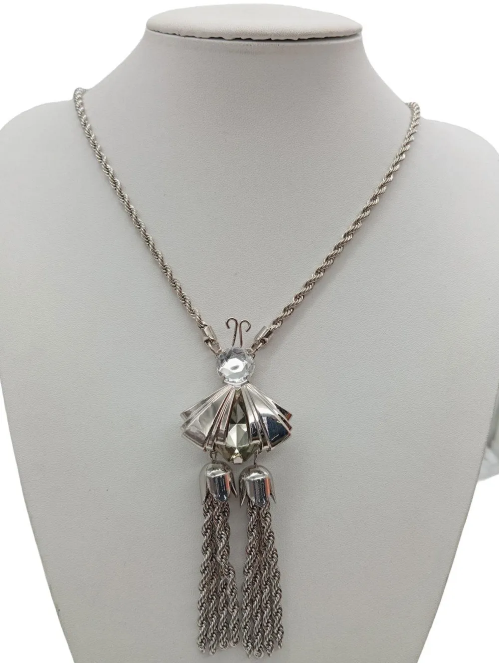 - Details: matt glänzendes Material, silberfarbiges Material, Ankerkettenglieder, feingliedrige Kette, große Anhänger, Glitzersteinverzierung