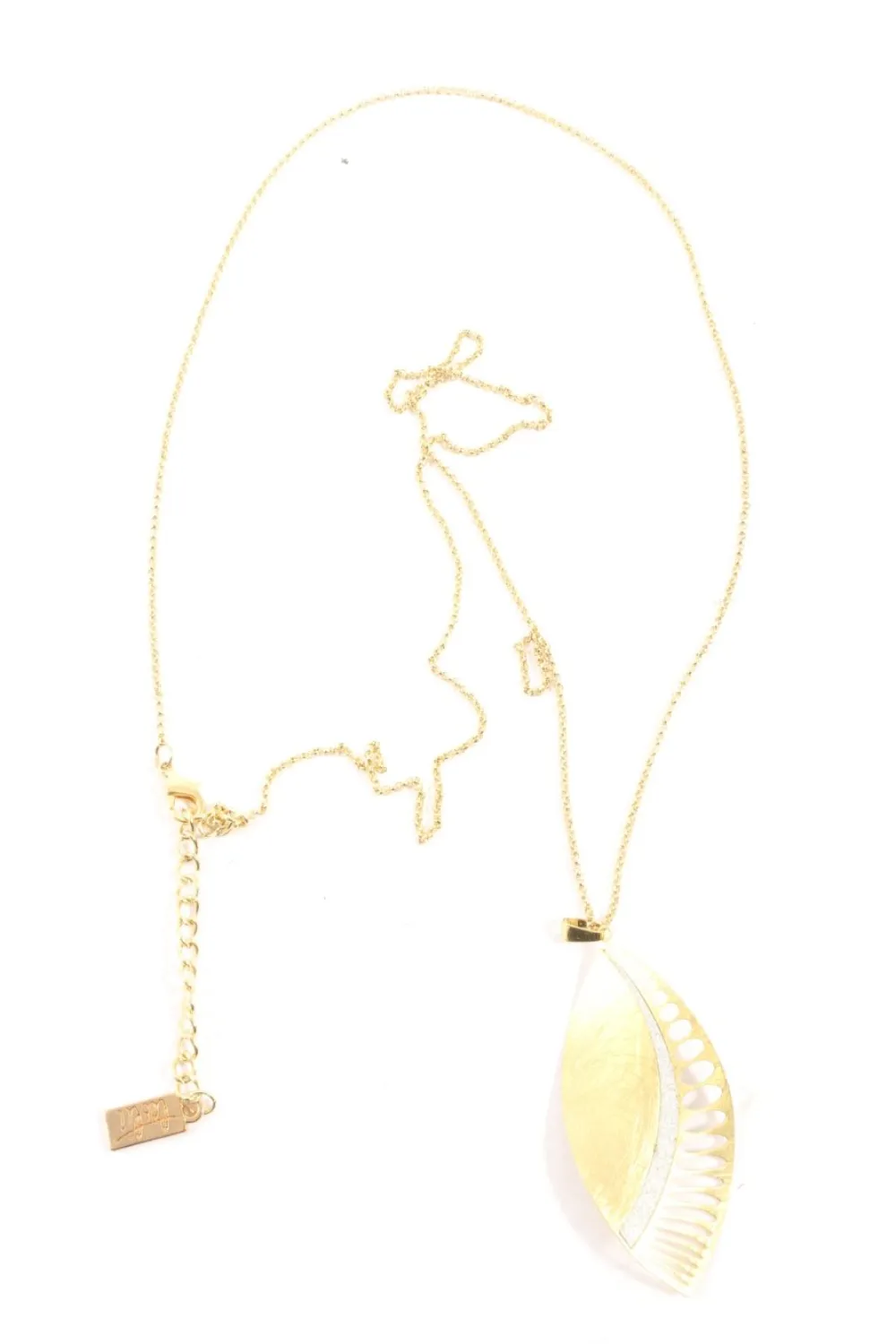 - Details: goldfarbiges Material, große Anhänger, Logo-Applikation aus Metall