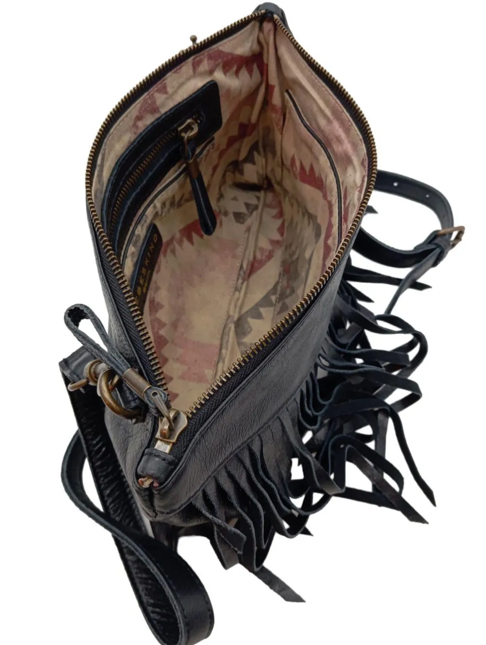 - Details: bronzefarbene Hardware, Schulterriemen, Fransenbesatz, Karabinerelemente, Metallelemente, gemustertes Futter, Logo-Applikation innen aus Leder, Reißverschlussinnenfach, verschließbares Innenfach