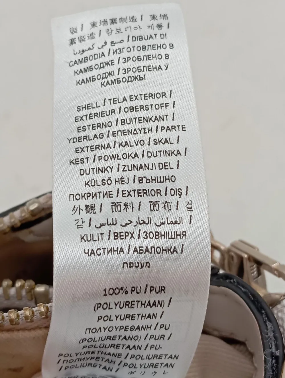 - Details: goldfarbene Hardware, Tragekette, Karabinerelemente, Logo-Applikation aus Metall, Metallelemente, Paspelkanten, Reißverschlusstasche außen, gemustertes Futter, Logo-Applikation innen aus Metall, Reißverschlussinnenfach, verschließbares Innenfach