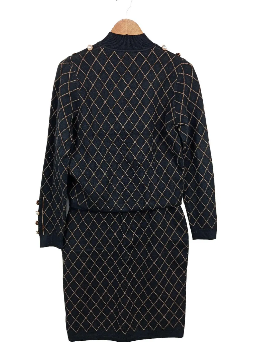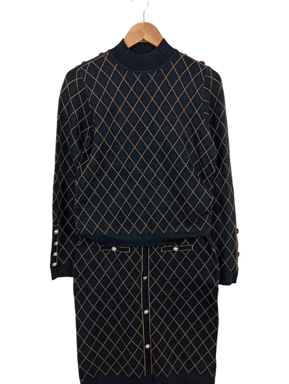 - Bluoltre Strick Twin Set, schwarz-beige Allover-Druck