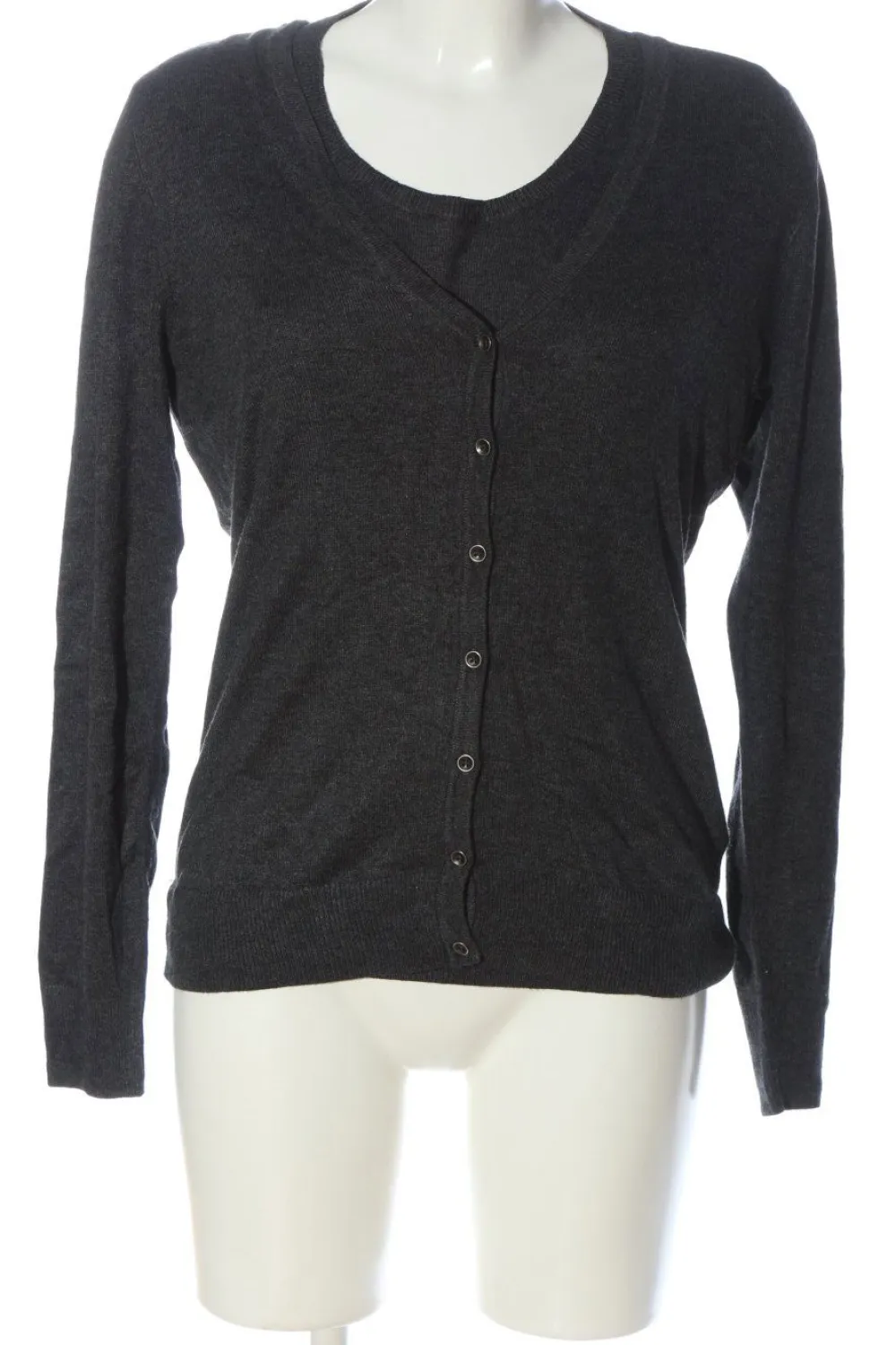 - Knopfleisten-Ausschnitt, Rundhalsausschnitt, V-Ausschnitt, angeschnittener Kragen, Armbündchen, Knopfverschluss, meliert, Casual-Look, klassischer Stil