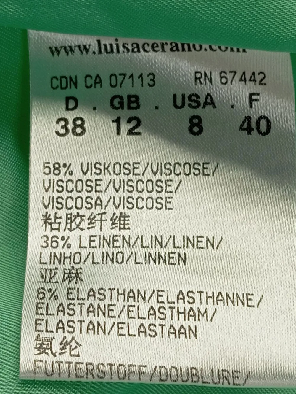 - Außenmaterial: 58% Viskose, 36% Leinen, 6% Elasthan