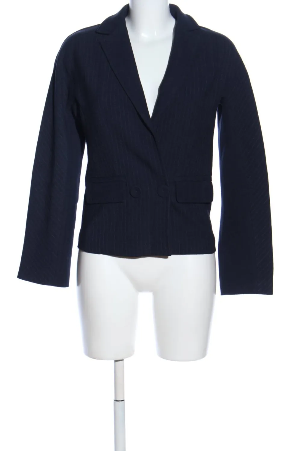 - tiefer V-Ausschnitt, Reverskragen, doppelreihiger Knopfverschluss, Pattentaschen, Streifenmuster, Business-Look