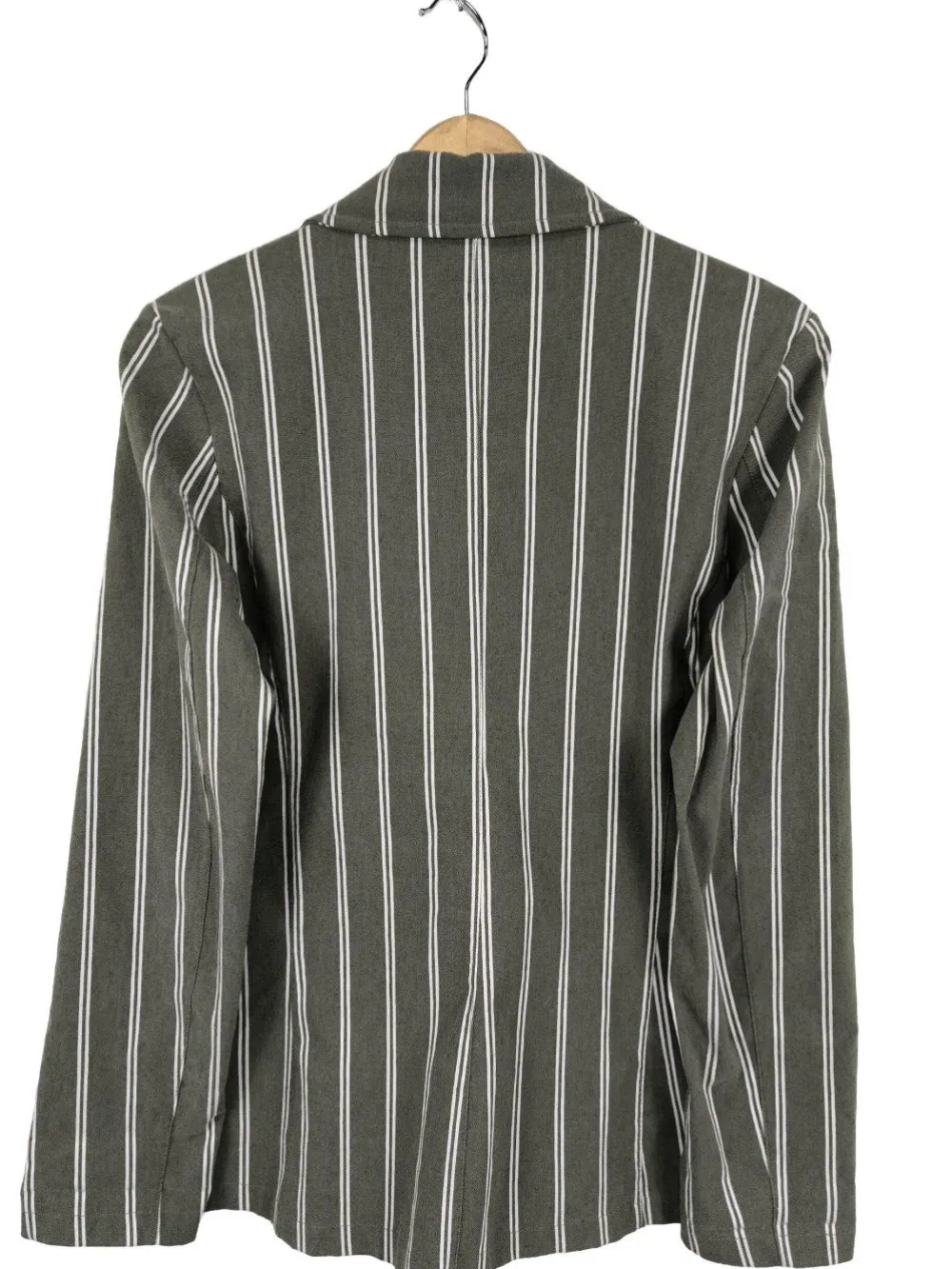- V-Ausschnitt, Umlegekragen, Bund am Ärmelsaum, Knopfverschluss, Pattentaschen, Streifenmuster, Casual-Look, Street-Fashion-Look, Vintage-Look