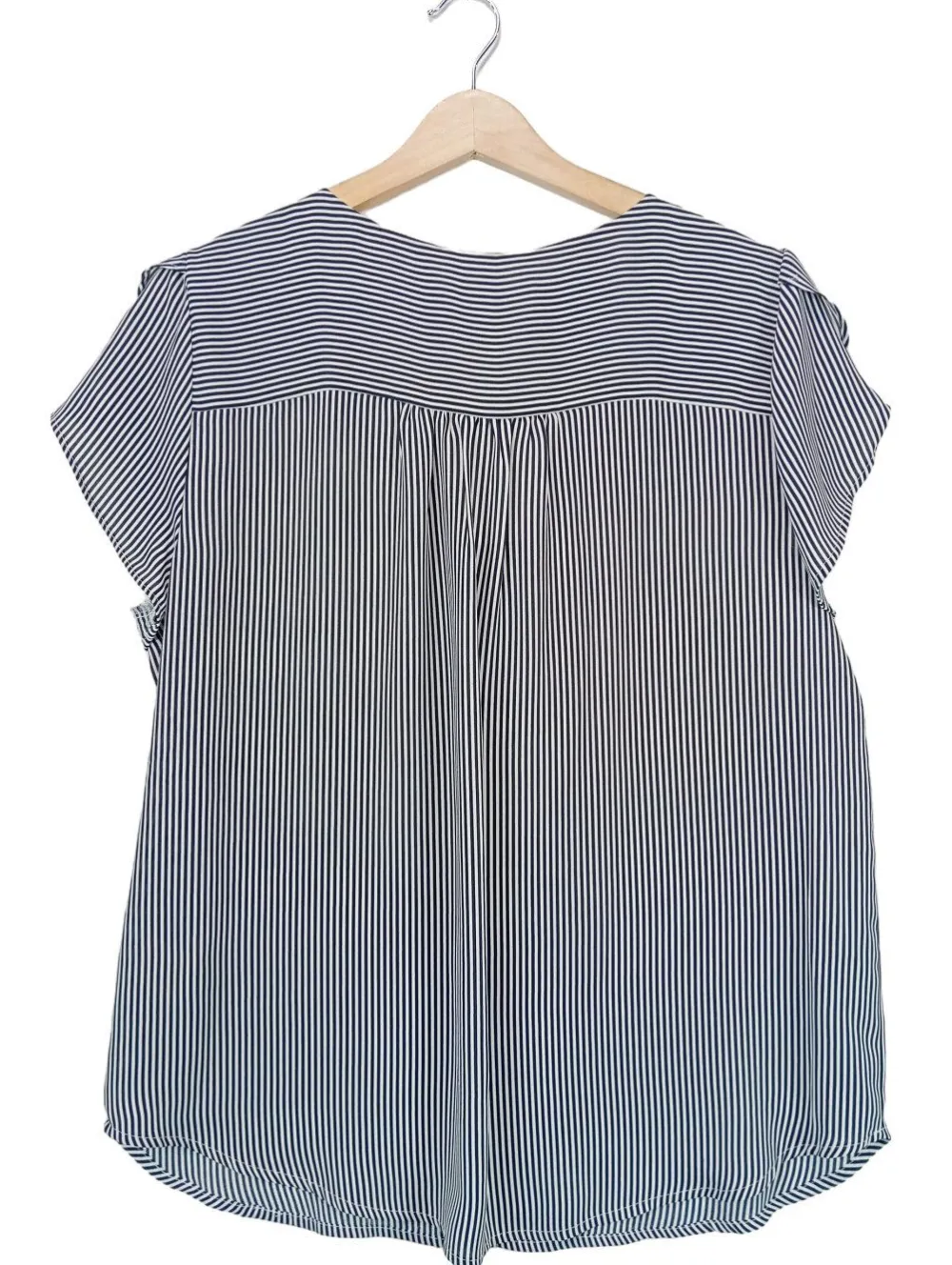 - V-Ausschnitt, Wellkanten am Ärmelsaum, Knopfverschluss, Streifenmuster, Casual-Look, schlichter Stil