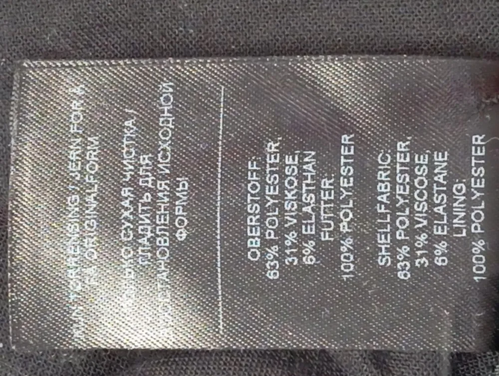- Außenmaterial: 63% Polyester, 31% Viskose, 6% Elasthan