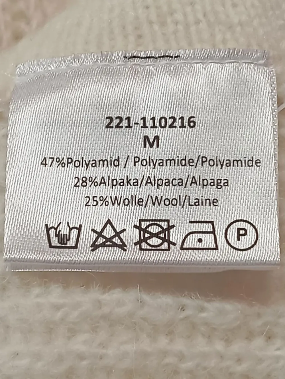 - Außenmaterial: 47% Polyamid, 28% Alpaka/Wolle/Tierhaar, 25% Wolle