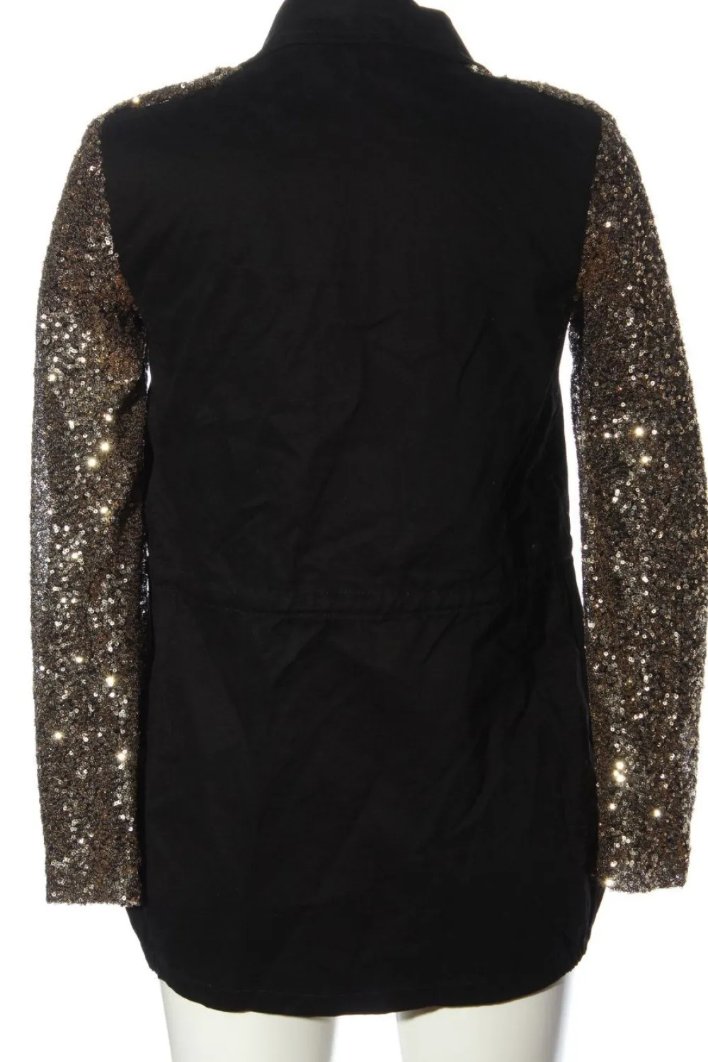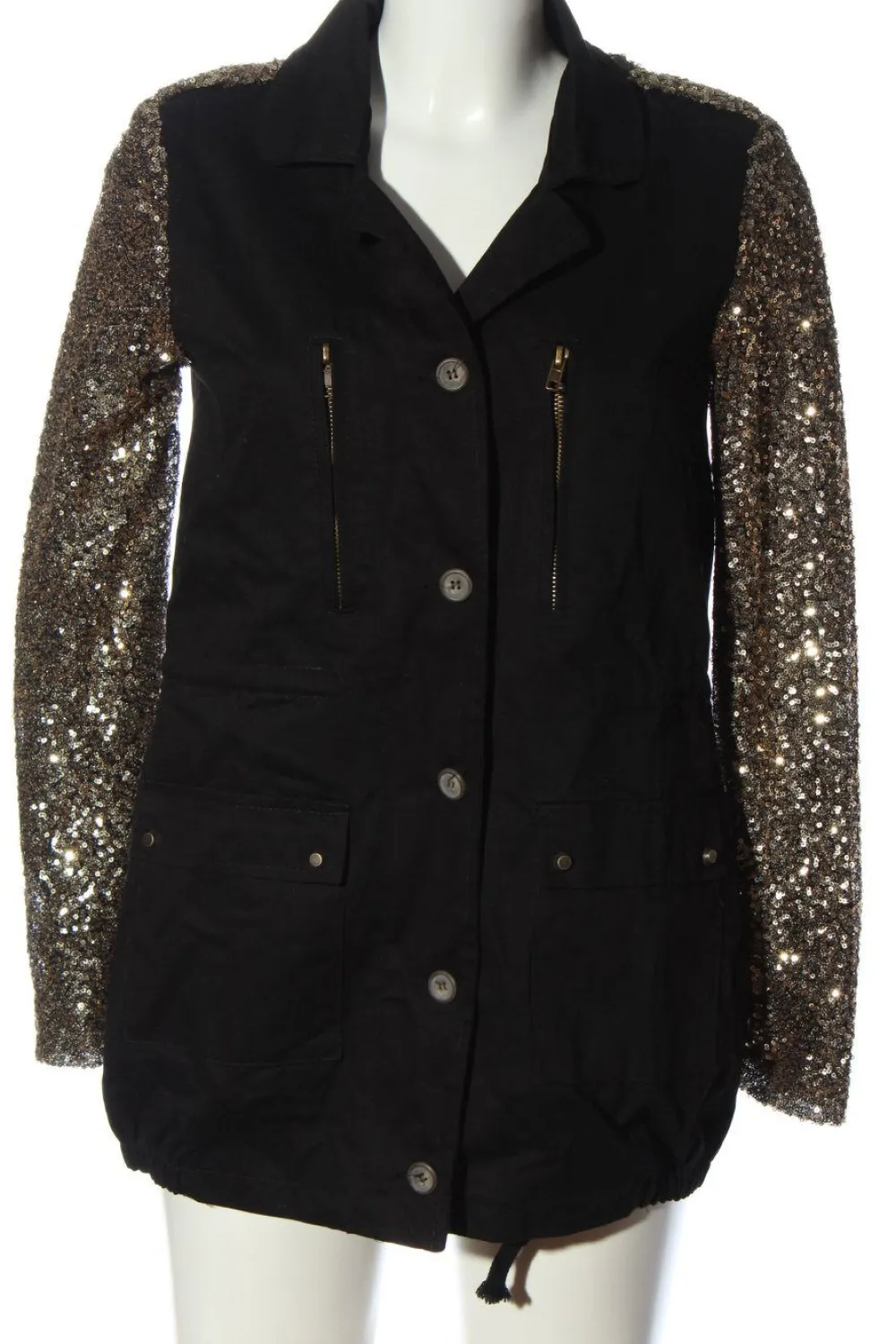- V-Ausschnitt, Umlegekragen, Bund am Ärmelsaum, Knopfverschluss, aufgesetzte Pattentaschen, Reißverschlusstaschen, Taschen mit Druckknopfverschluss, Casual-Look, Glitzer-Optik, Party-Look, Street-Fashion-Look