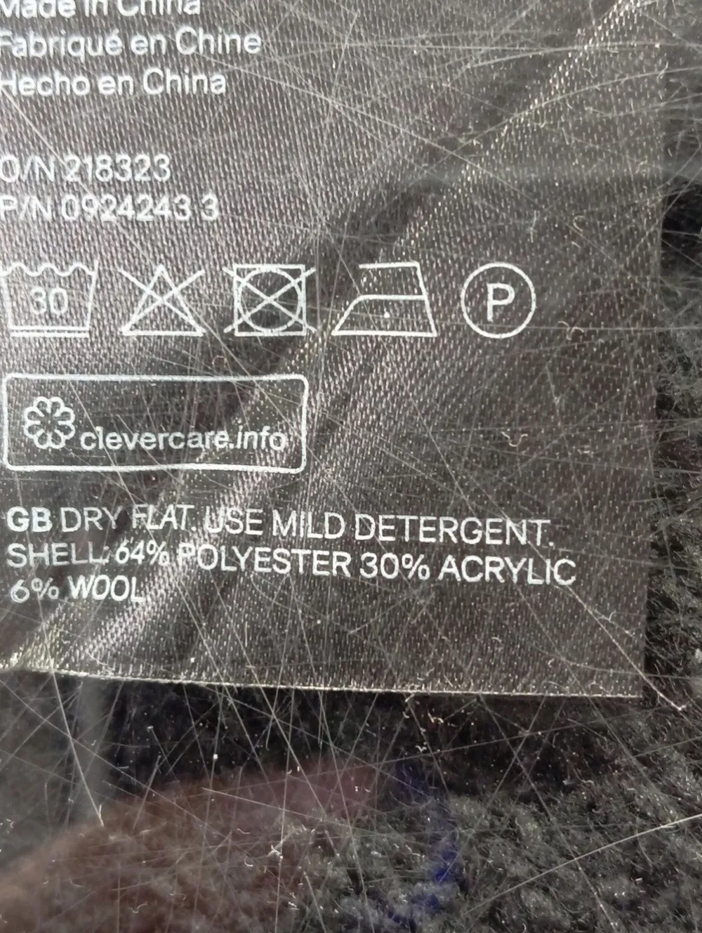 - Außenmaterial: 64% Polyester, 30% Polyacryl, 6% Wolle