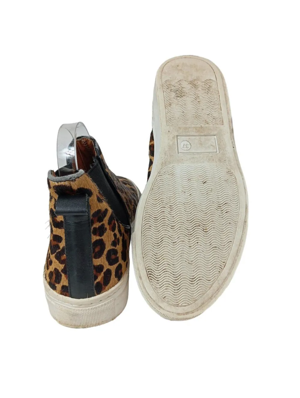 - genoppte Laufsohle, runde Schuhspitze, Schlupfeinstieg mit Elastikeinsatz, Leomuster, extravaganter Stil, Street-Fashion-Look