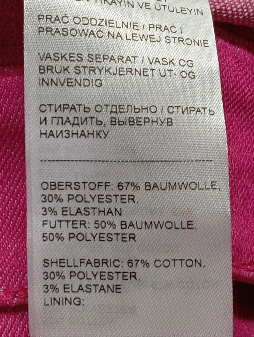 - Außenmaterial: 67% Baumwolle, 30% Polyester, 3% Elasthan