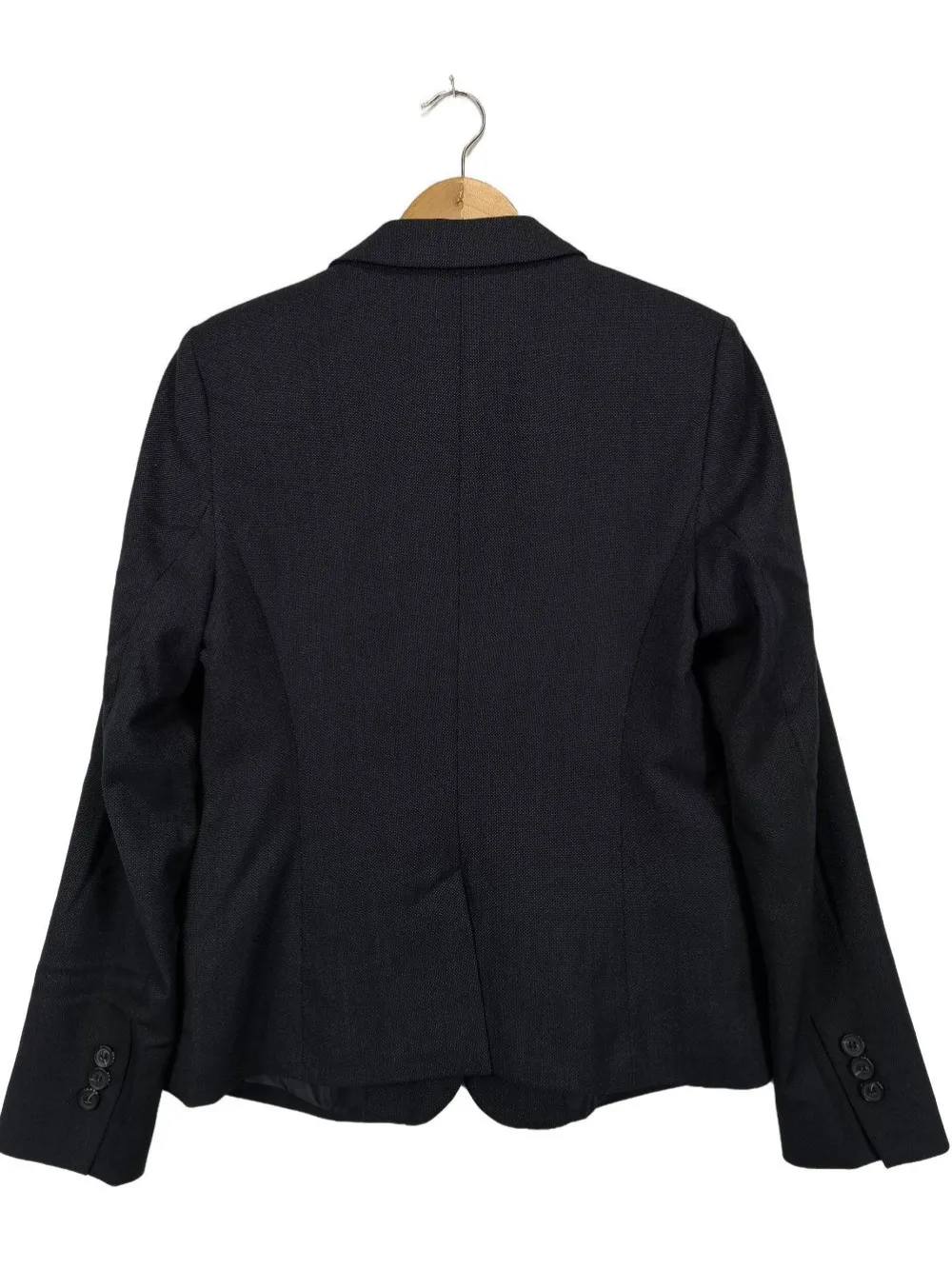 - V-Ausschnitt, Umlegekragen, Schlitz am Ärmelsaum, Knopfverschluss, Eingriffstaschen, Paspeltaschen, Business-Look, klassischer Stil