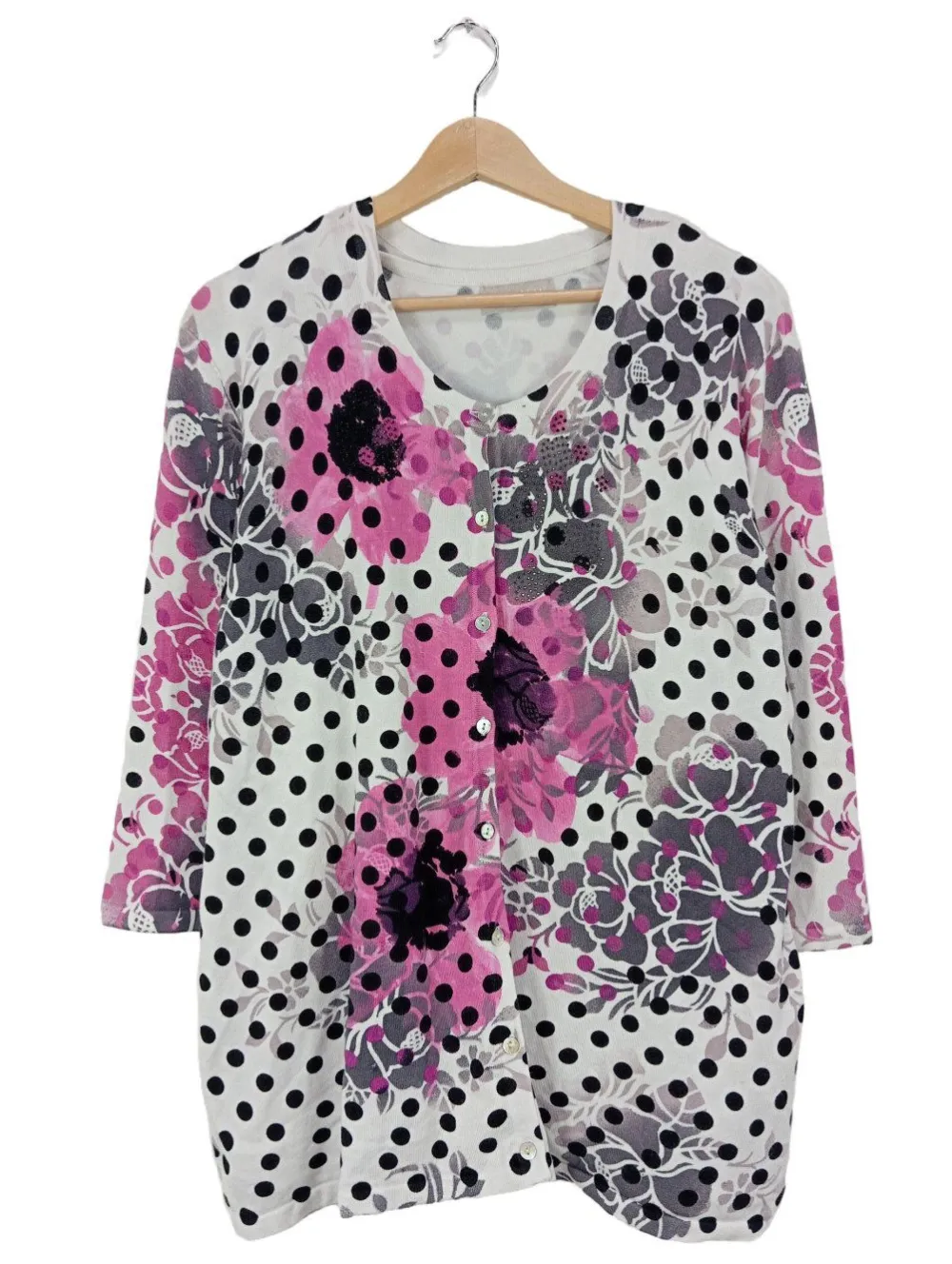- U-Ausschnitt, angeschnittener Kragen, Bund am Ärmelsaum, Knopfverschluss, Allover-Druck, Blumenmuster, Punktemuster, Casual-Look, schlichter Stil