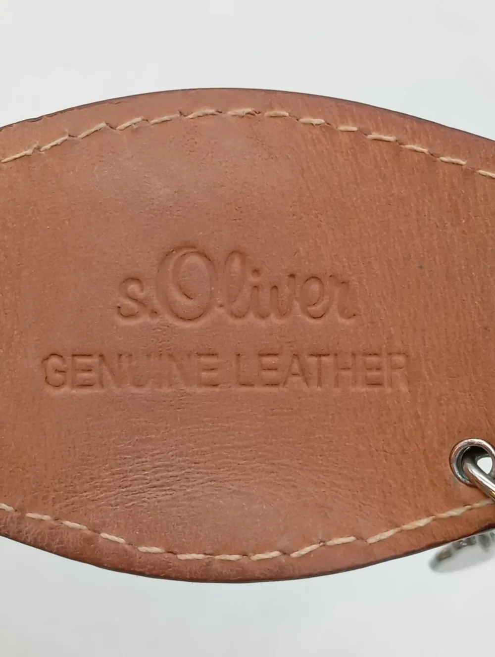 - Details: silberfarbiges Material, Logo-Applikation aus Leder