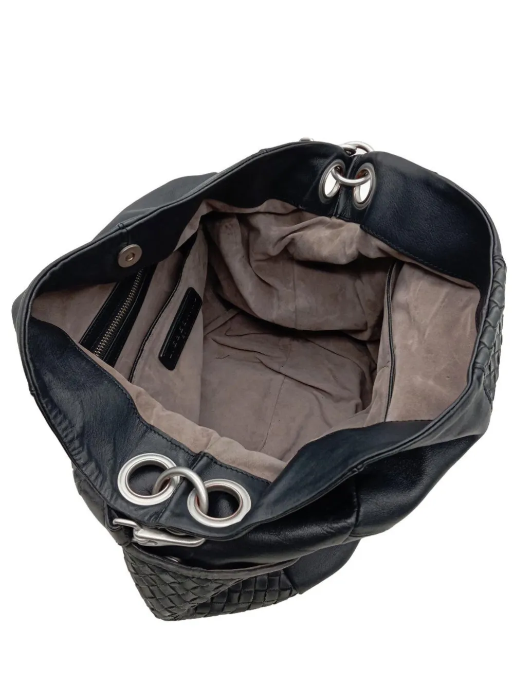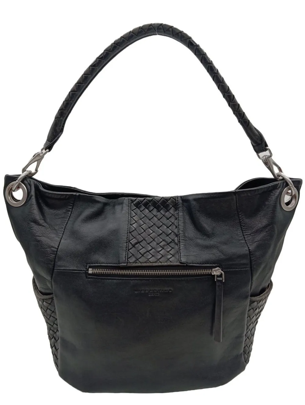 - Details: silberfarbene Hardware, Henkel, Karabinerelemente, Reißverschlusstasche außen, Ringelemente, Logo-Applikation innen aus Leder, Reißverschlussinnenfach