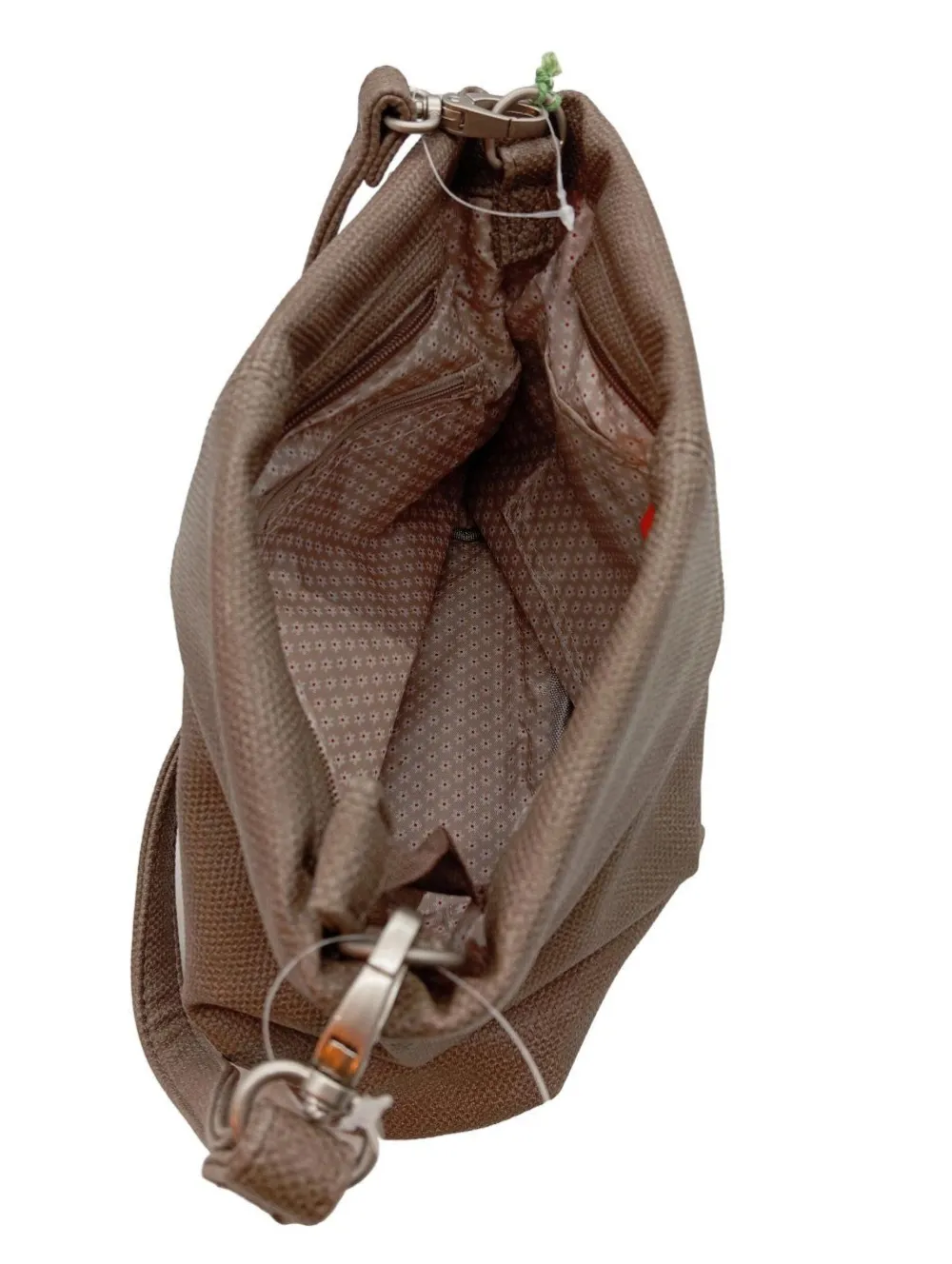 - Details: Schulterriemen, Karabinerelemente, Logo-Applikation, Metallelemente, gemustertes Futter, Reißverschlussinnenfach, verschließbares Innenfach